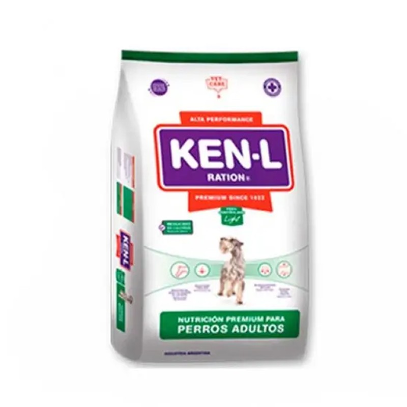 El Ken-L Light para perros adultos contiene al menos un 26% de proteína bruta, un 9% de grasa y un 5% de fibra, diseñado para el control de peso con un bajo aporte calórico (menor a las 4.000 kcal/kg). Incluye L-carnitina para el metabolismo de grasas, fibra para la saciedad, omegas para la piel y el pelo, y extracto de yucca para reducir olores.
